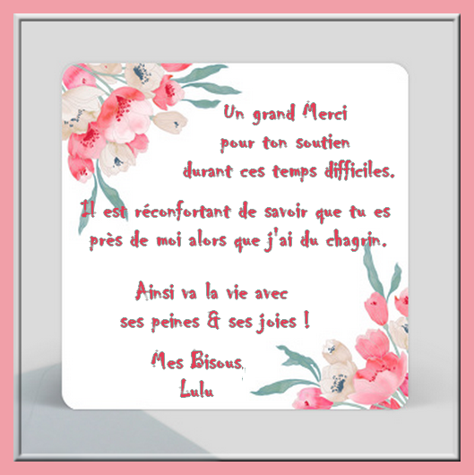 Ainsi va la vie avec ses problèmes qu'ils soient tristes ou gaies. Il faut juste reprendre son chemin sans jamais se retourner & donner de l'Amour autour de soi. Avec le temps la douleur s'estompera & les bons moments passés avec lui vont ressurgir, je n'en doute pas un instant.